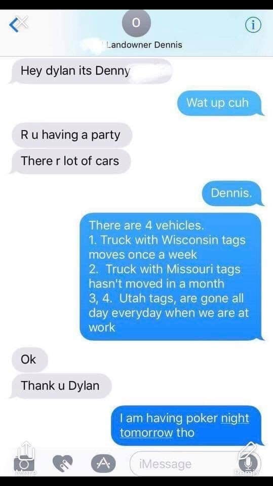 When he saw four cars parked in front of the apartment, he suspected his tenant might be throwing a party. When he asked him about it, Dylan calmly explained that there were only four cars outside the apartment (how is that “a lot of cars”?) and none of them has anything to do with him. However, he admitted he was hosting poker night the next evening.