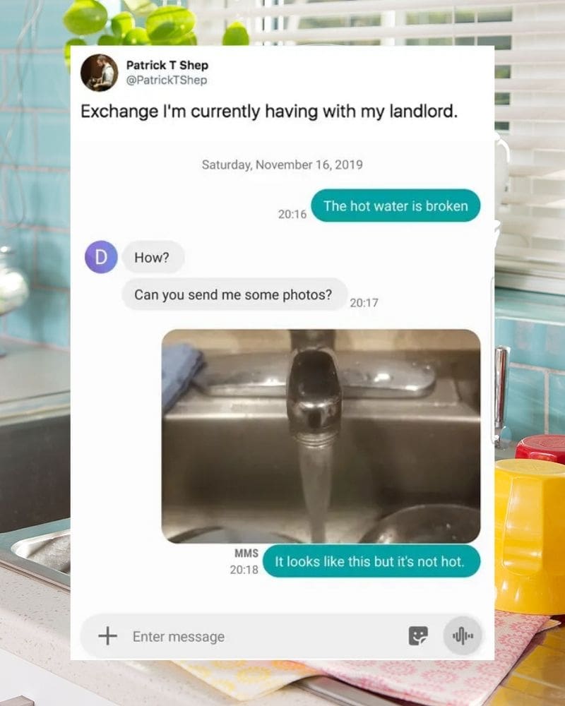 Patrick couldn’t help but share this ridiculous exchange on social media, and we can’t blame him. When he informed his landlord there was no hot water in the apartment, the landlord’s response should’ve been “I’ll send someone to fix it.” Instead, he replied, “can you send some photos?” Patrick was probably just as baffled as we are.
